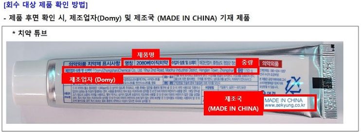 이 표기가 치약 튜브 또는 케이스 뒷면에 있다면, 회수 대상일 가능성이 높습니다. 제품명만 보고 판단하기보다는 제조 정보 확인이 우선입니다.